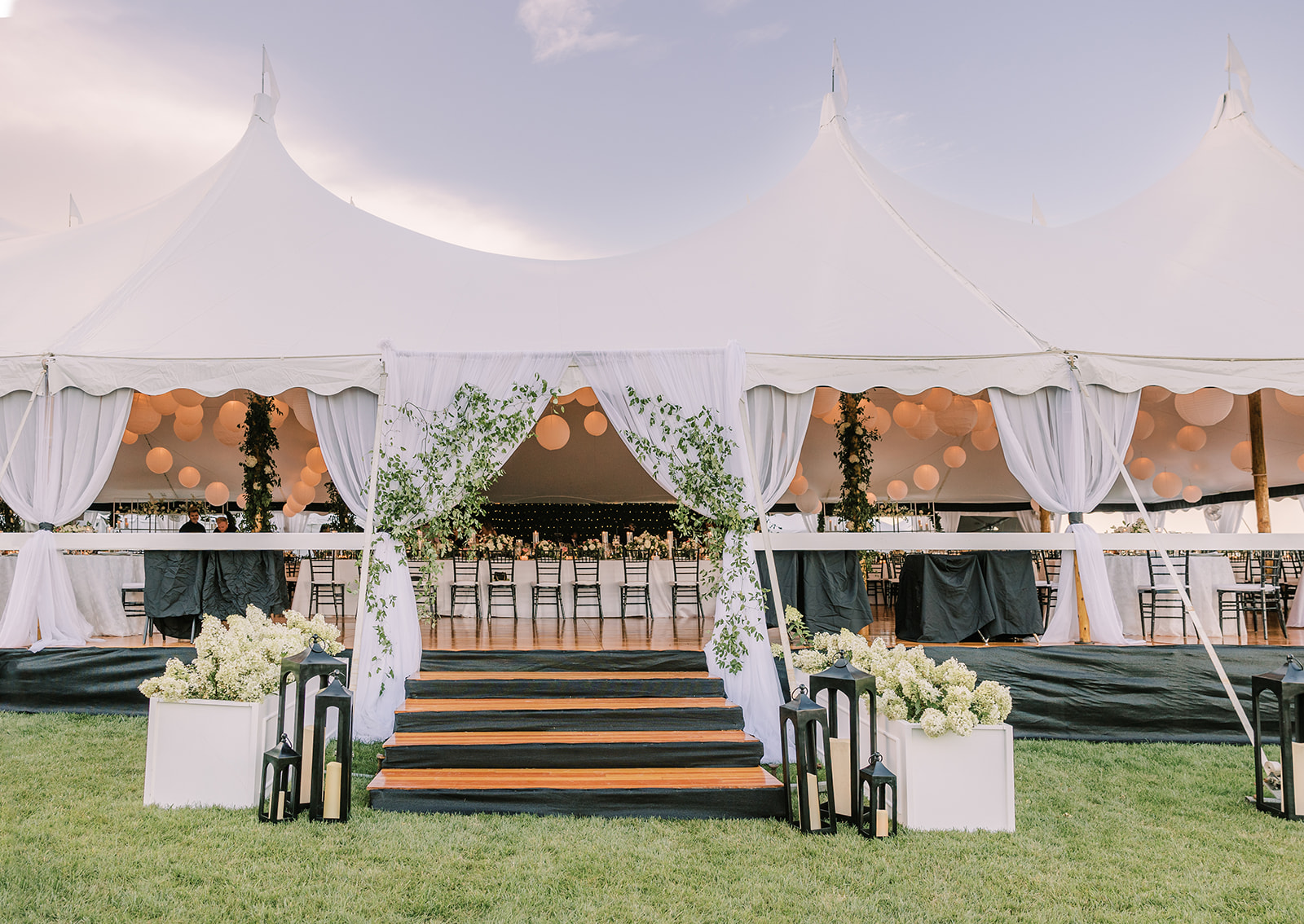 Building a wedding venue out of a private estate home takes an abundance of ingenuity and vision. In all likelihood, a tent will be required for your wedding reception. This may also extend to your ceremony, cocktail hour or rain plans. Addtionally you will need a dance floor, flooring, power outlets, guest facilities, and, depending upon the season of your wedding, outdoor heaters or fans.